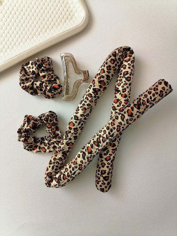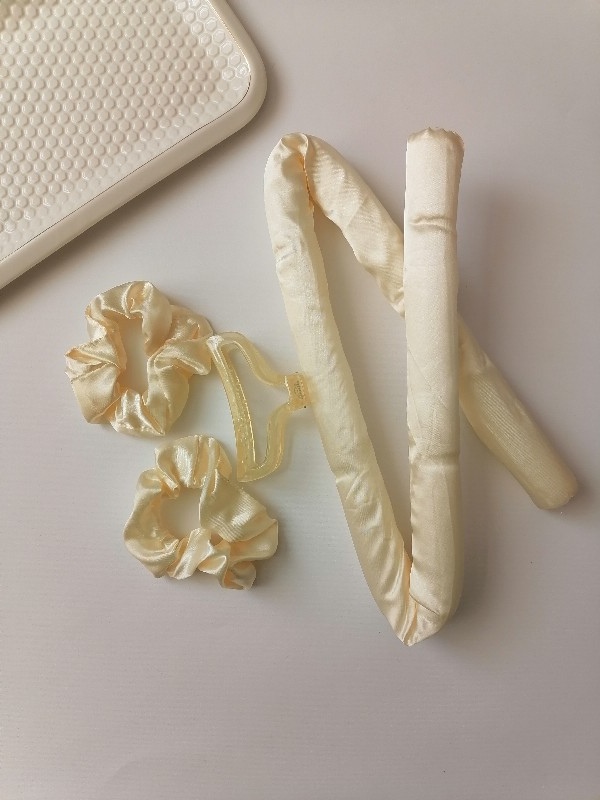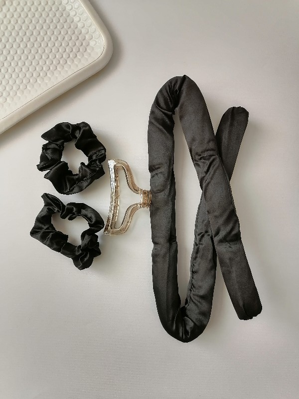 هر بسته دو عدد اسکرانچی ساتن یک کلیپس و یک ربدو برای پیچیدن موها و حالت دادن آن دارد